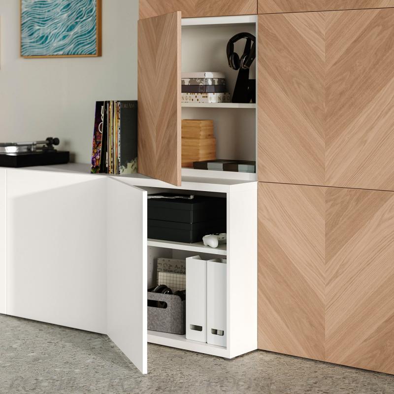 この床置き式サイドボードは、たっぷりの収納スペースを備え、2種類の奥行きの組み合わせが活気ある印象をつくります。 スタイリッシュなホワイトと温かみのあるオーク材突き板のコンビネーションが、モダンでナチュラルな見た目を演出します