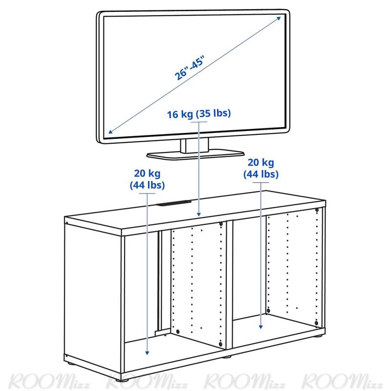 テレビ台は、上に置くテレビの幅より少し幅が広いものをお選びください。このテレビ台は45インチまでのテレビを置くのに最適です。それよりも大きいサイズのテレビは、天板の最大荷重より軽い場合に限り、置くことができます