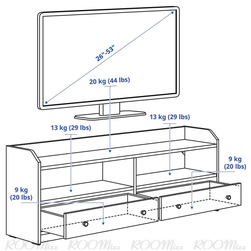 テレビ台は、上に置くテレビの幅より少し幅が広いものをお選びください。このテレビ台は53インチまでのテレビを置くのに最適です。それよりも大きいサイズのテレビは、天板の最大荷重より軽い場合に限り、置くことができます