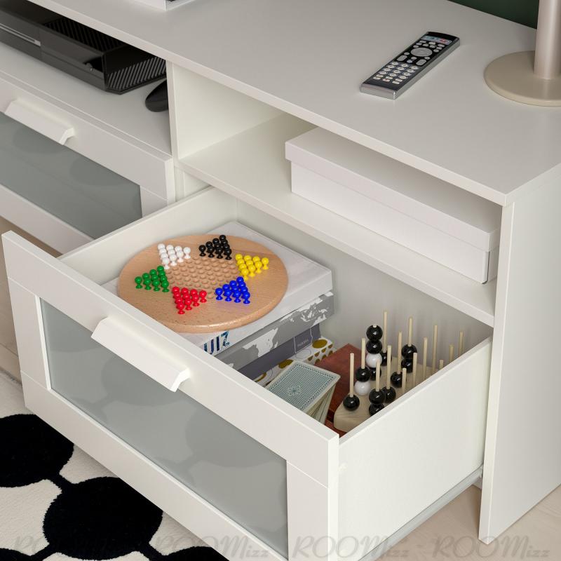 テレビのまわりがかたづいていると、大好きなテレビドラマシリーズに没頭できます。ゲームや、コントローラー、メディアアクセサリーなどは大きな引き出しに収納。コード類はすっきりとまとめて配線口に通しましょう。