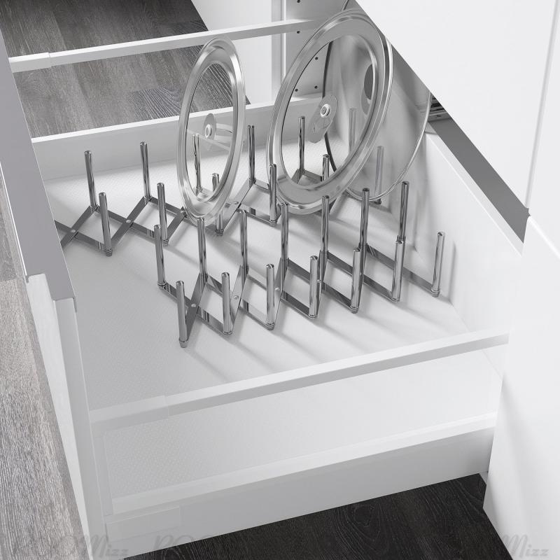 鍋ぶたオーガナイザーは引き出しの中、または棚の上のどちらでも使えます。ほかのキッチンオーガナイザーと組み合わせて、キッチンをすっきりとかたづけましょう